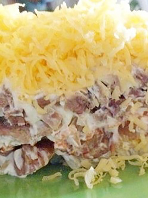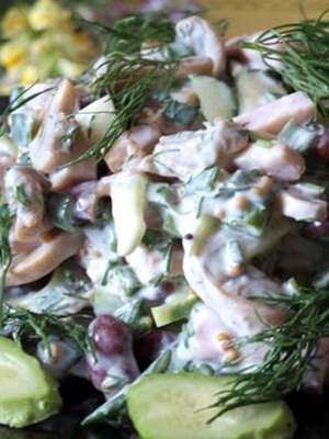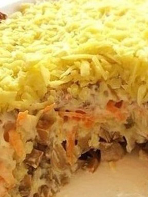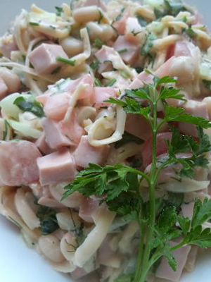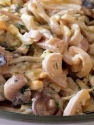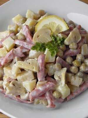 Les champignons sont coupés, frits pendant 10 minutes dans une petite quantité d'huile et refroidis. Ensuite, combiner avec de fines rondelles de tomates, d’œufs et de saucisses finement hachés, d’oignons émincés, assaisonner avec de l’huile, du vinaigre, du poivre, du sel et mélanger. Décorer de persil haché.