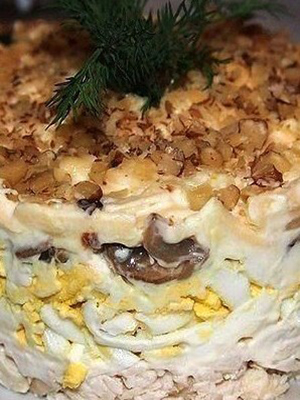 - Terminez la salade en frottant les blancs d’œufs. Placez le plat au réfrigérateur pendant environ 15 minutes, puis retirez soigneusement la forme culinaire et garnissez d'aneth et d'un morceau de champignon.