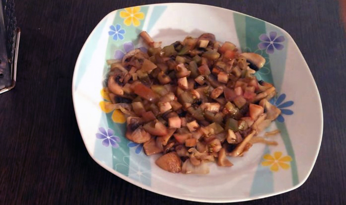 - Dans une grande quantité d'huile végétale (au moins 0,5 tasse), faire revenir les oignons émincés jusqu'à coloration, ajouter les champignons et les œufs hachés, le sel.