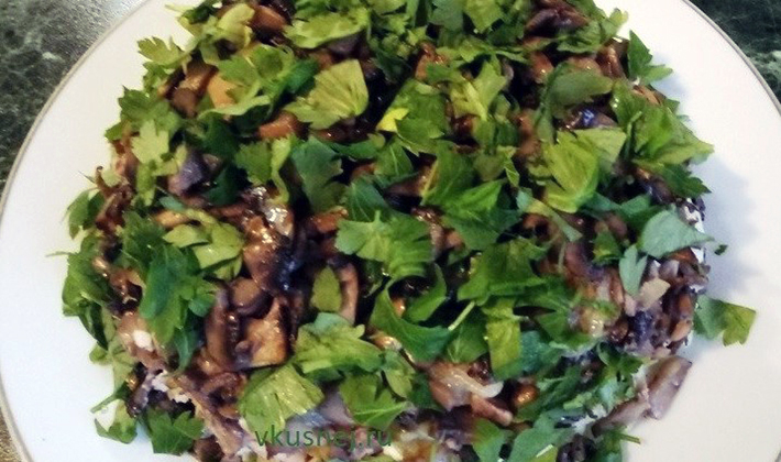 Ci-dessous dans la sélection sont proposées des recettes avec des photos de salades avec des champignons frits dans des variantes simples et complexes, de sorte que parmi eux, vous pouvez choisir le plus approprié pour des vacances ou un jour de la semaine.