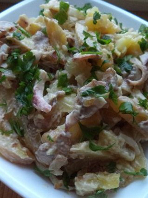 - Bien mélanger le tout, saler et assaisonner avec de la mayonnaise et du vinaigre, dilués avec de l'eau.