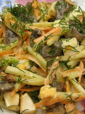 - Salade de poitrine de poulet avec champignons frits, concombres et saison du fromage avec mayonnaise, sel, poivre, moutarde et bien mélanger à nouveau.