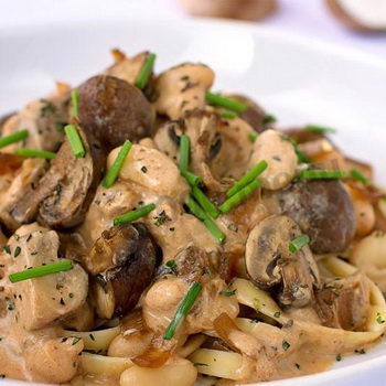 Ajouter la sauce aux champignons et à la viande, mélanger et laisser mijoter pendant 3-5 minutes.