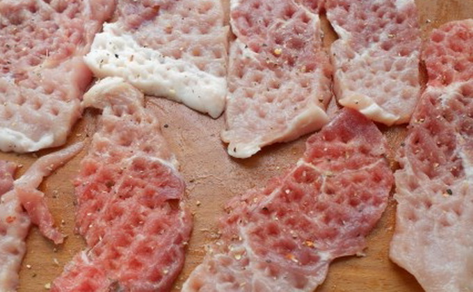 Lavez la viande à l'eau, coupez-la en morceaux et étendez-la sur un torchon.