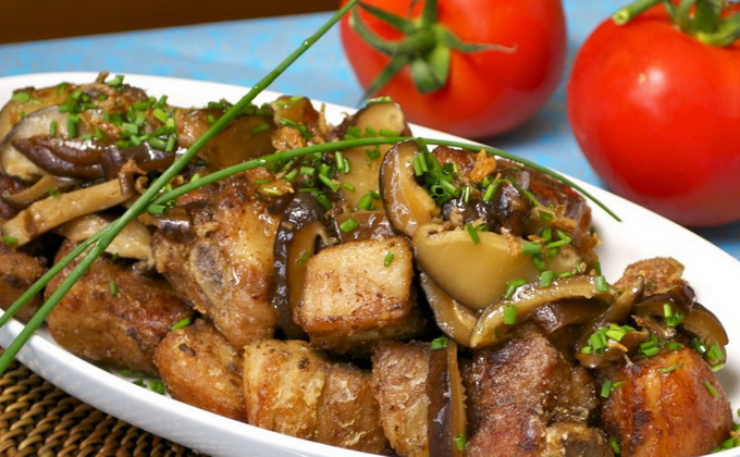 Nous servirons du porc frit avec des champignons au miel, accompagné de riz blanc ou de pommes de terre bouillies. Vous apprécierez votre plat, vous verrez!