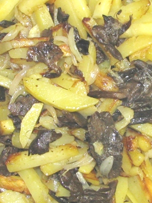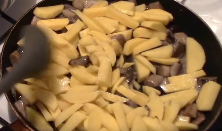 - Dans une poêle séparée, dans un minimum d'huile, faites frire les pommes de terre jusqu'à ce qu'elles soient dorées, puis combinez avec les champignons et le saindoux.