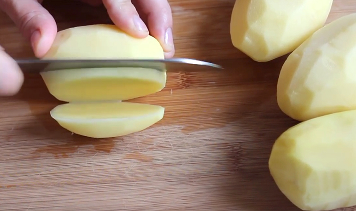 - Retirez la couche supérieure des pommes de terre, lavez-les et coupez-les en fines tranches ne dépassant pas 3-4 mm.