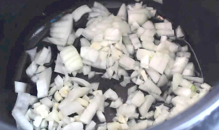 - Versez un peu d'huile dans le bol multicuiseur et mettez les champignons avec les oignons.
