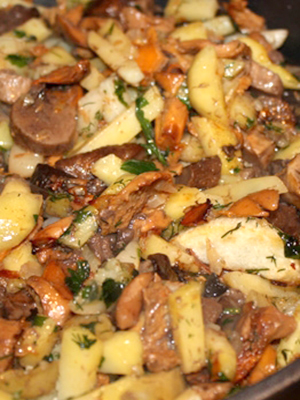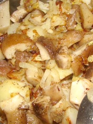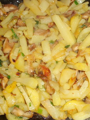 - Dans une casserole séparée, les champignons safran sont frits en tranches et combinés avec des pommes de terre et des oignons.