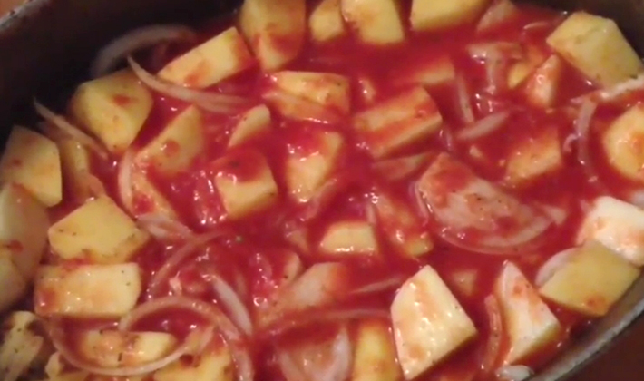 Versez le mélange de tomates dans la casserole, puis ajoutez les pommes de terre coupées en petits morceaux.