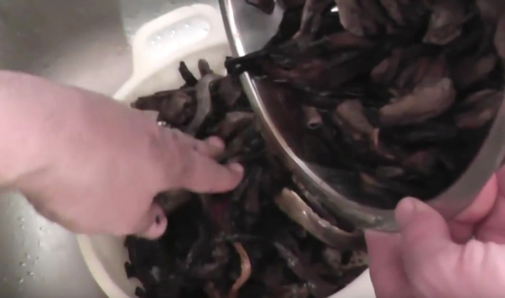 Les champignons sont nettoyés et bouillis dans l'eau pendant 15 minutes, jetés dans une passoire, permettant de les égoutter.