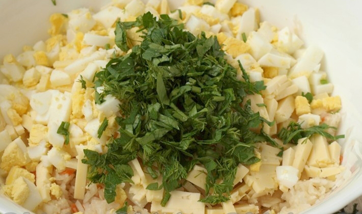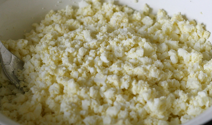 Faire bouillir les œufs pendant 10 minutes, verser de l'eau froide, laisser refroidir, nettoyer et hacher avec un couteau.