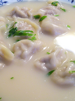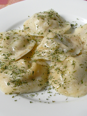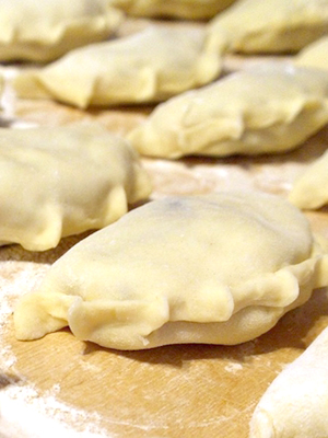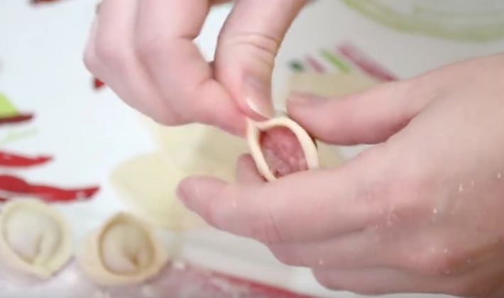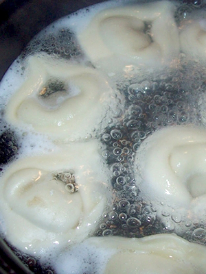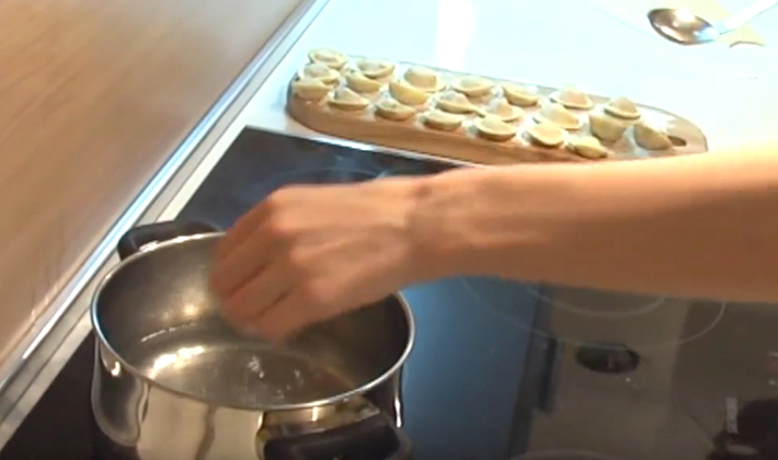 - Disposer sur la pâte, façonner les raviolis et les jeter à l'eau bouillante.