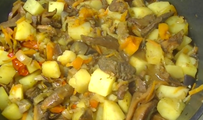 - Après avoir retiré le couvercle de la casserole, nous continuons à cuire la viande et les champignons pendant encore 10 minutes, en remuant continuellement pour éviter les brûlures.