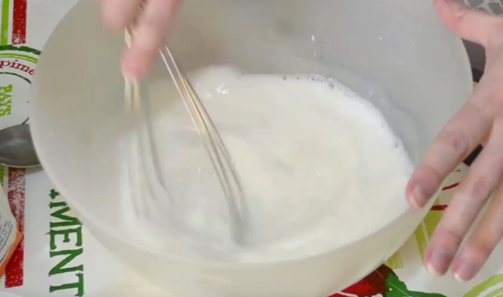 - Dans une assiette séparée, combiner l'oeuf, la crème sure et la farine, battre un peu.