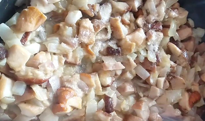 - Couper les champignons cuits en rondelles et les faire revenir avec les rondelles d'oignon jusqu'à ce qu'elles soient cuites, saler et poivrer.