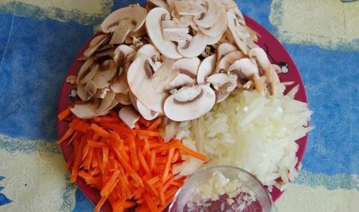 Ensuite, vous pouvez commencer à farcir: couper les champignons et les oignons en tranches, râper les carottes sur une râpe grossière.