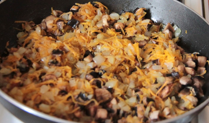 Séparément, faire frire les carottes et mélanger avec la masse d'oignon et de champignons, saler et poivrer au goût.