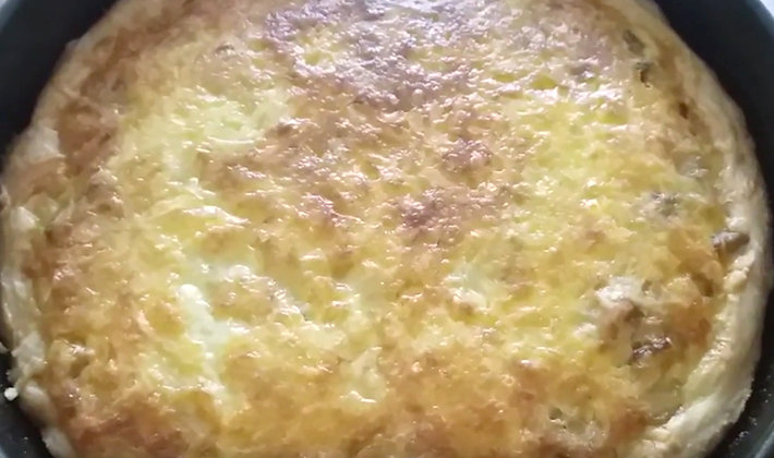 Et une autre recette très intéressante pour la tarte aux champignons. Même une femme au foyer novice se chargera de sa préparation, car au lieu de l’essai, on prend du pain pita, qui est acheté dans un magasin.