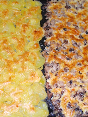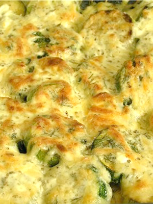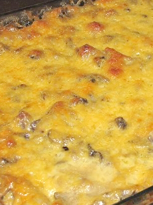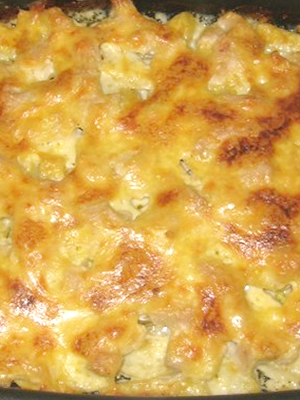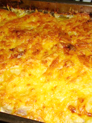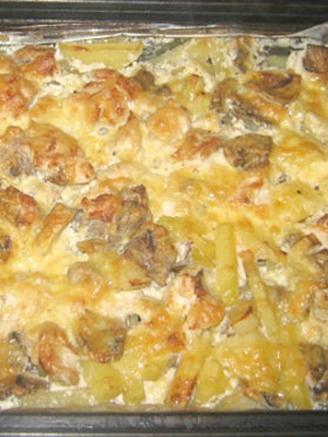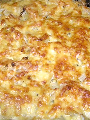 - Recouvrir de crème sure arrosée, saupoudrer de fromage dur râpé et mettre au four préchauffé.