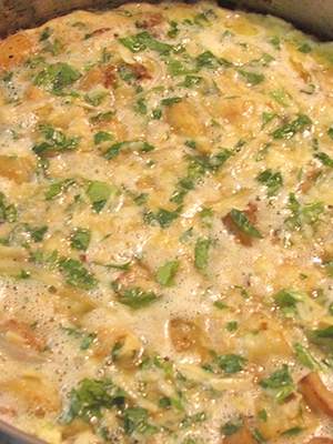 - Épluchez les pommes de terre, lavez-les, coupez-les en fines rondelles et mélangez-les aux champignons.