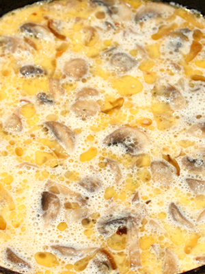 - Mélanger avec les champignons, ajouter la farine, saler, poivrer et bien mélanger.