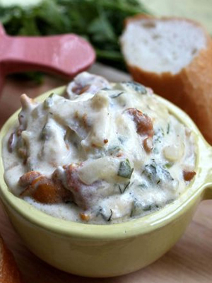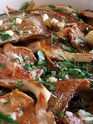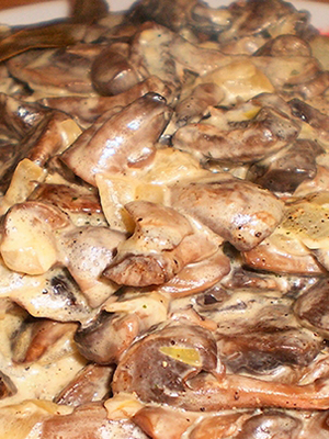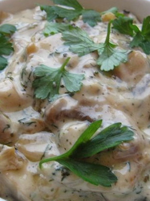 - Après le signal, les champignons à la crème sure et à la sauce à l'ail sont disposés en portions, éventuellement saupoudrées d'herbes hachées et servies à la table.
