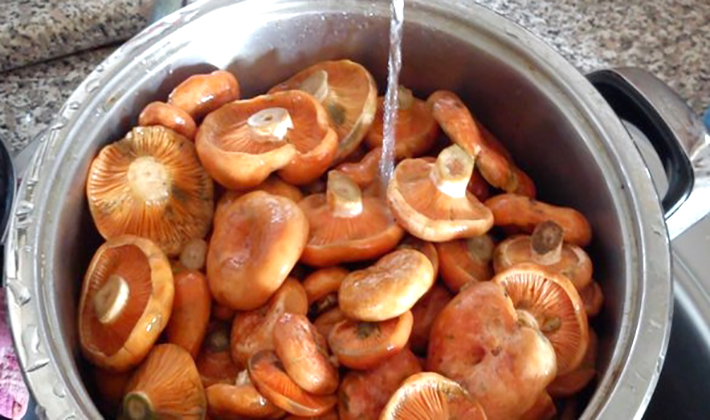 - Nous appliquons la même procédure pour les champignons au safran: nous débarrassons la saleté, nous lavons et coupons.