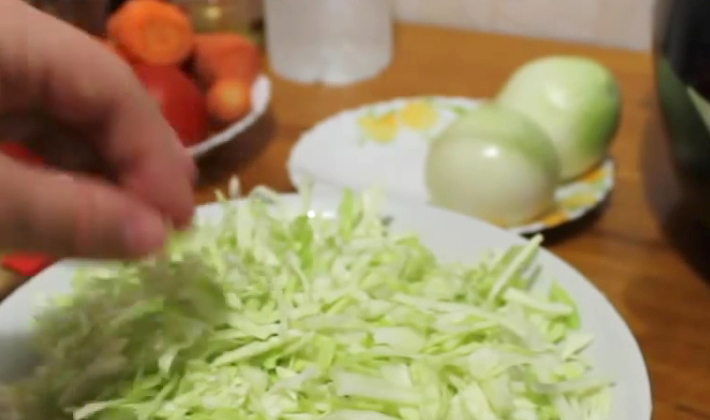 Râpez le chou, hachez les carottes sur une râpe grossière et coupez l'oignon en demi-rondelles.