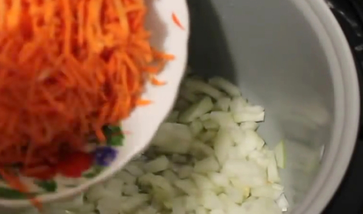 - Coupez l'oignon, mettez-le dans le bol du multicuiseur, versez l'huile et, en activant le mode “Frying” ou “Baking”, faites frire pendant 5 à 7 minutes.