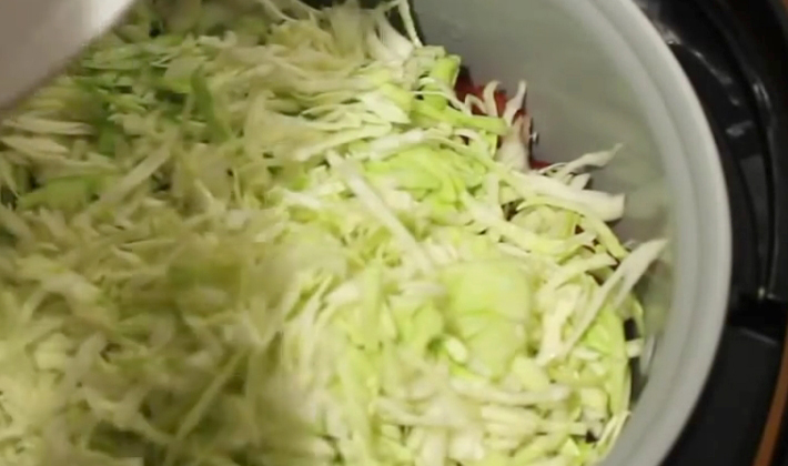 La pâte de tomate est élevée avec de l’eau chaude et introduite dans la mijoteuse avec du chou déchiqueté.