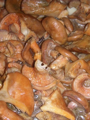 - Les champignons safran pelés et lavés (il est préférable de prendre de gros spécimens) sont coupés en tranches d’au moins 0,5 cm.