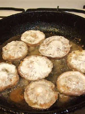 - Ensuite, tremper chaque morceau dans la farine et l'étendre immédiatement dans une casserole avec de l'huile chaude. Les champignons doivent flotter dans l'huile et être immédiatement frits des deux côtés jusqu'à ce qu'ils soient dorés.