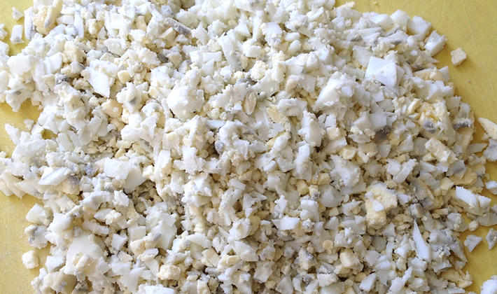 Faire bouillir les œufs, laisser refroidir, peler et broyer.