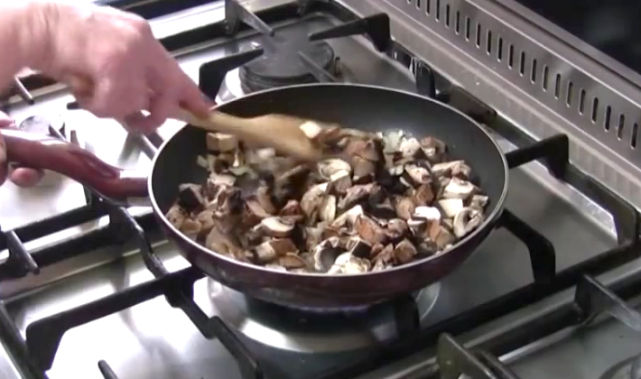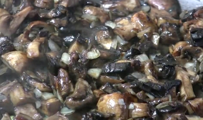 - Ajoutez les oignons hachés aux champignons et faites-les frire pendant 20 minutes à feu doux, en remuant constamment pour éviter les brûlures.