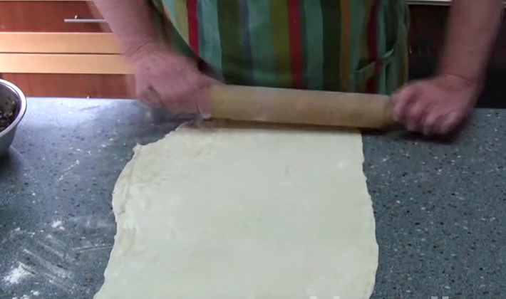- Sur une table pilée avec de la farine, étalez la pâte en une mince couche, coupez-la en carrés et étalez le mélange.