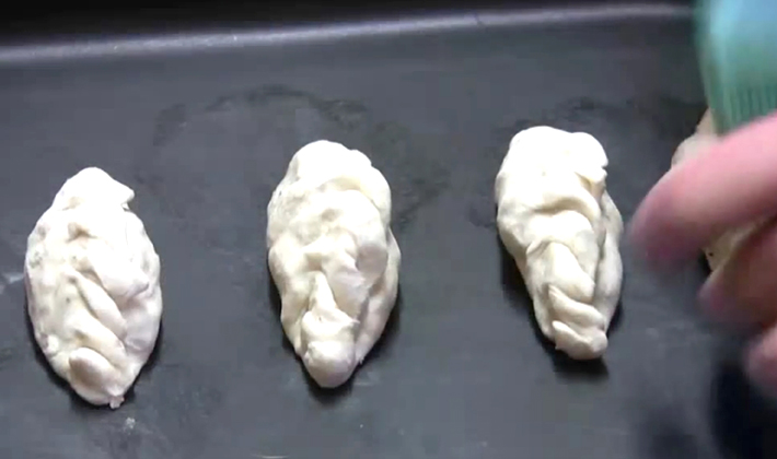 - Battez l'oeuf avec un fouet, graissez le dessus des tartes et mettez au four chaud.