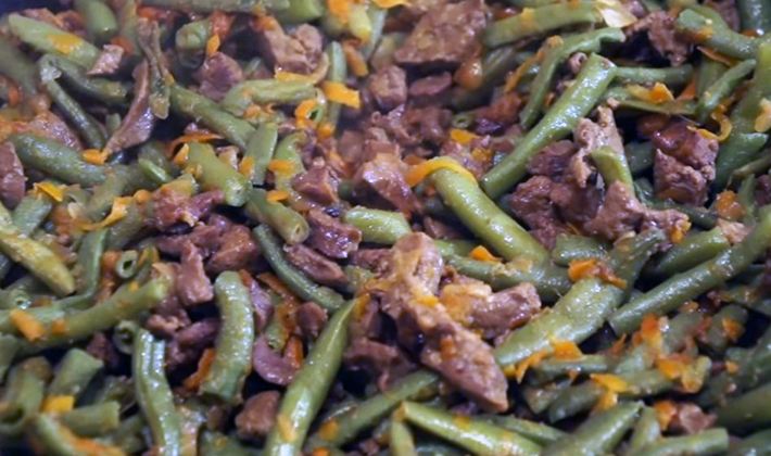 - En fin de cuisson, une salade de foie de bœuf aux champignons et d'autres ingrédients sont agrémentés de feuilles de céleri hachées finement mélangées à des pois verts.