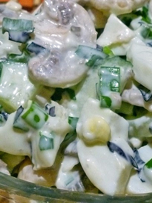 - Salade au foie, concombres, œufs, oignons et champignons avant de servir, versez la mayonnaise et garnissez d'herbes.