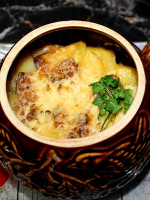 Épluchez les oignons et les champignons, hachez-les finement, faites-les frire 10 à 15 minutes dans l'huile et mettez-les dans les pots avec le foie et l'huile. Mélanger la farine avec du lait dans lequel le foie a vieilli et verser dans des pots, ajouter le bouillon chaud et les épices. Couvrir les pots remplis de foie de bœuf, d'oignons et de champignons, placer dans le gril et cuire pendant 50 à 60 minutes à une température de 260 degrés et à un taux de ventilation élevé.