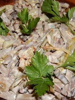 - Salade de foie aux champignons. assaisonné de crème sure, mettre au réfrigérateur pendant 30 minutes et parsemer de légumes verts finement hachés avant de servir.