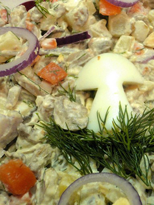 - Mettre dans une lame, verser avec de la mayonnaise et décorer avec les produits qui composent la salade et le persil.