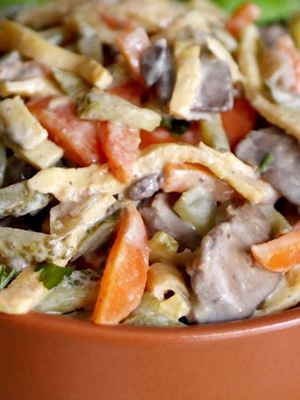 - Salade de foie de porc aux champignons, carottes et oignons à la crème sure