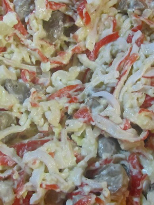 Écraser le foie de morue avec une fourchette. Couper les champignons en fines tranches. Épluchez, lavez et hachez les oignons. Couper le poivron en rondelles. Pelez et hachez l'oeuf. Mélangez le foie de morue avec des oignons, des champignons, des œufs et de la mayonnaise.
