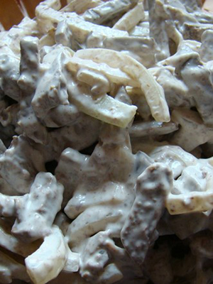 - Couper les champignons en lanières, les faire bouillir dans de l'eau salée, laisser refroidir et mélanger avec le foie et les oignons, assaisonner avec la crème sure.