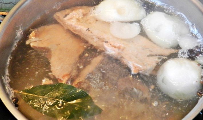 Faites bouillir de l'eau dans une casserole, salez, ajoutez quelques pois de piment de laurier et de la feuille de laurier, baissez le filet de poisson. Cuire le poisson pendant 20 minutes. Débranchez et laissez refroidir dans le bouillon.