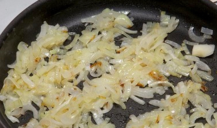 Coupez l'oignon en fines demi-anneaux ou lanières, mettez-les dans une casserole. Faire frire dans une petite quantité d'huile à feu doux, ne pas utiliser beaucoup d'huile, car l'oignon doit l'absorber complètement.