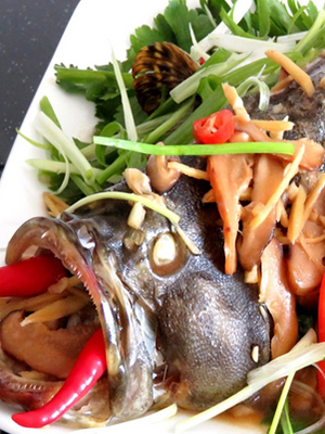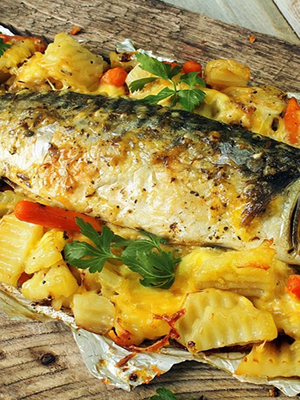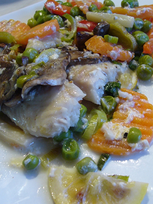 - Cuisson du poisson cuit avec des légumes et des champignons