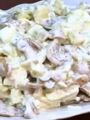 Salade aux champignons et au poisson est un bon apéritif pour un dîner de fête. Surtout ce plat est idéal pour les vacances du Nouvel An.