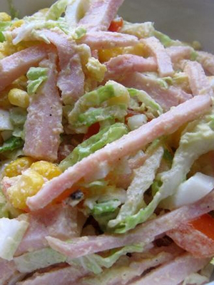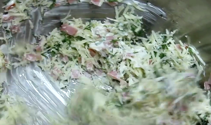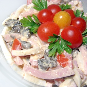 Les oignons et les champignons coupés en dés sont frits dans une poêle. Le jambon, les œufs et les tomates sont hachés dans les mêmes portions. Après avoir refroidi les oignons et les champignons, tous les composants sont mélangés, salés, poivrés et assaisonnés de mayonnaise.